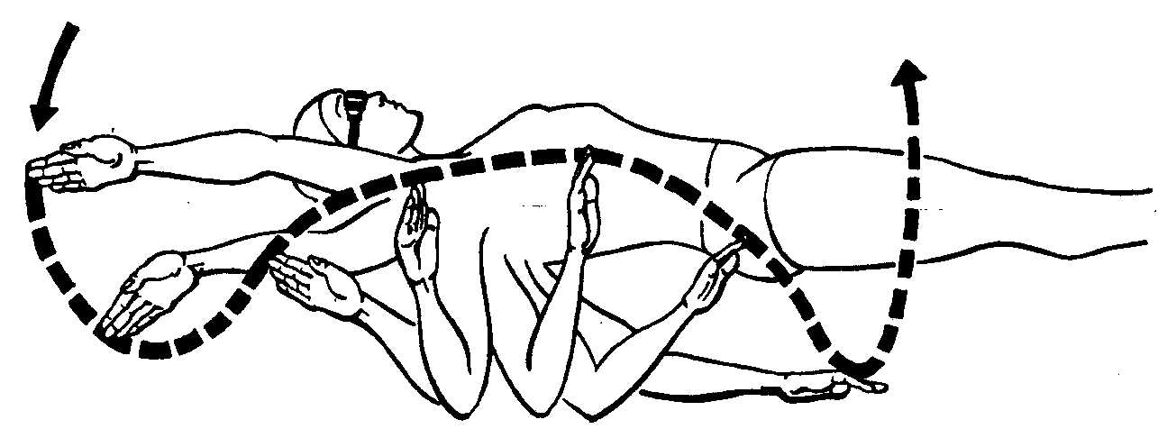 энергичный гребок до бедра с одновременным переворотом на бок (в сторону