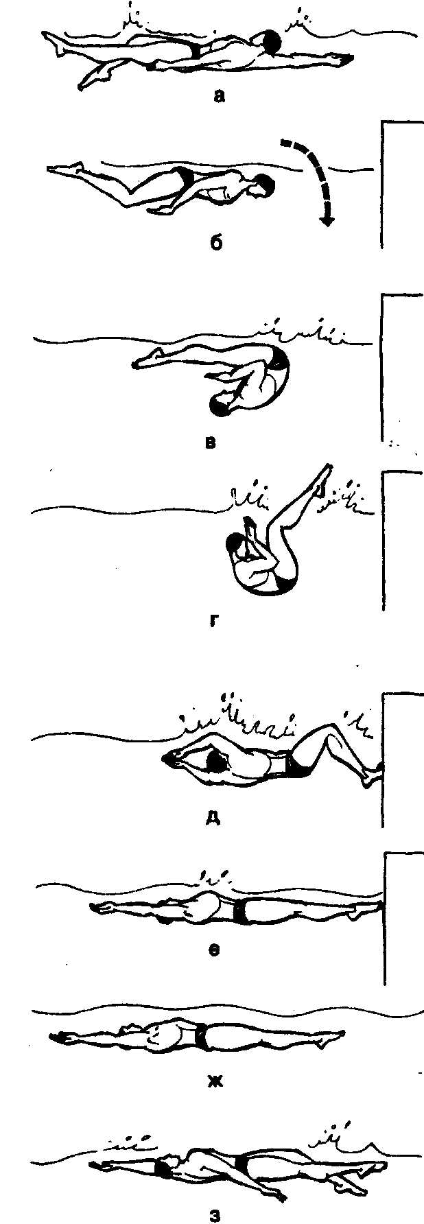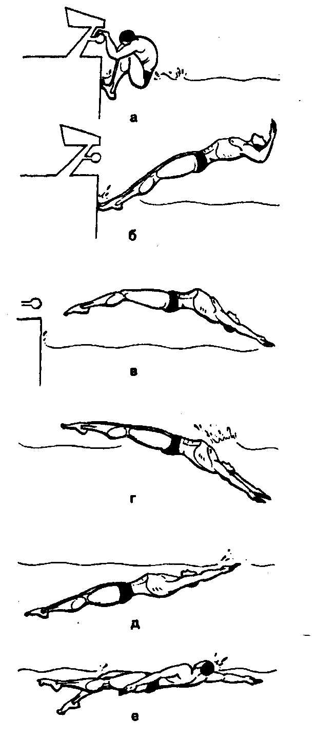 вытянуты вперед и мгновенно начинает отталкивание от стенки (рис. 27д, 27е).