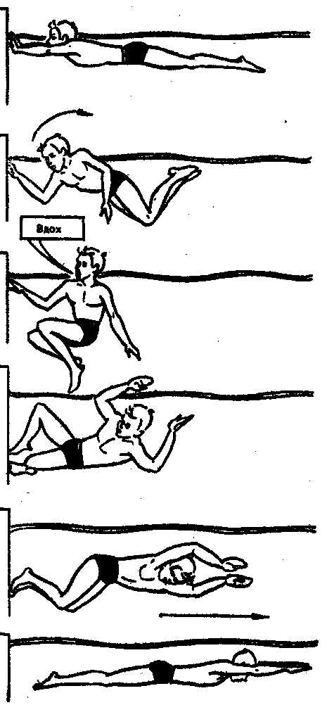 выбрасывает ноги из воды на стенку бассейна. Затем рука, касающаяся стенки,
