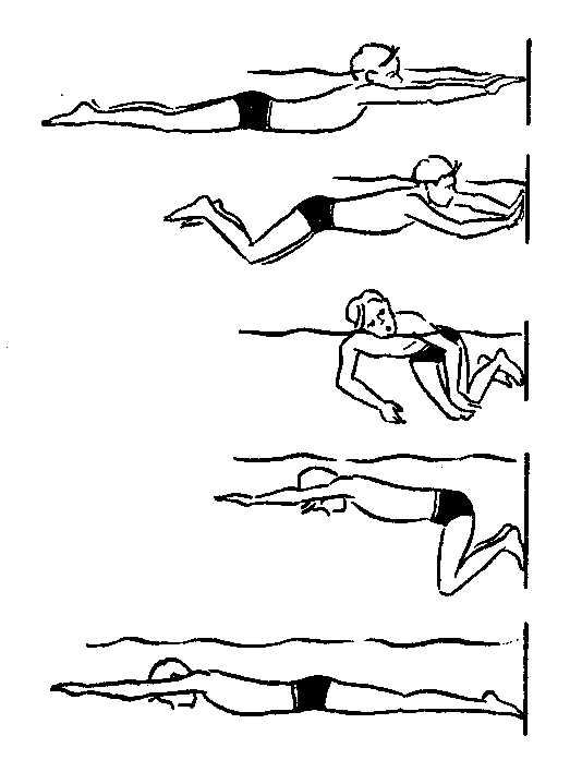 идет в направлении касающейся руки. Голова пловца уходит под воду, бедра и таз