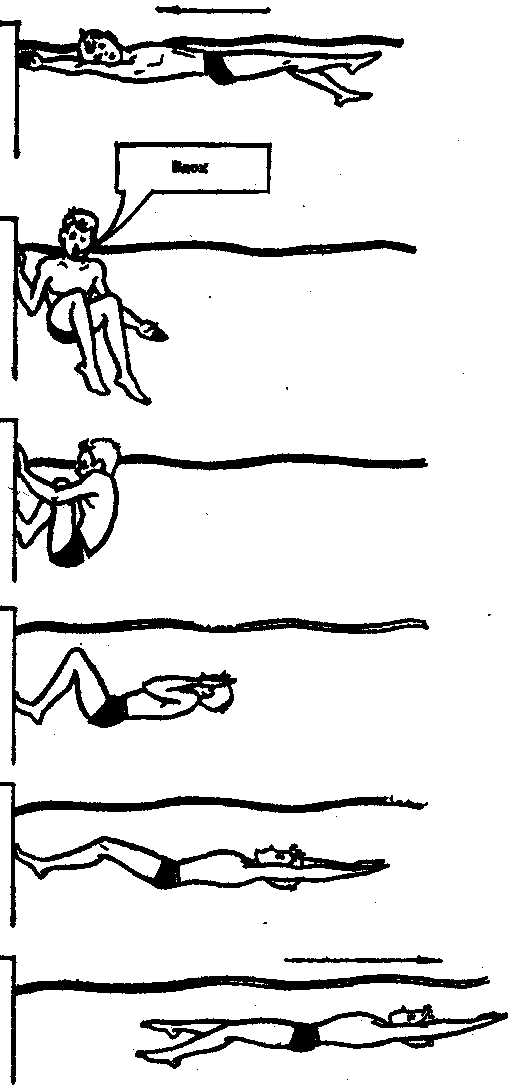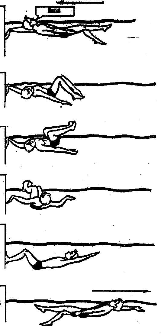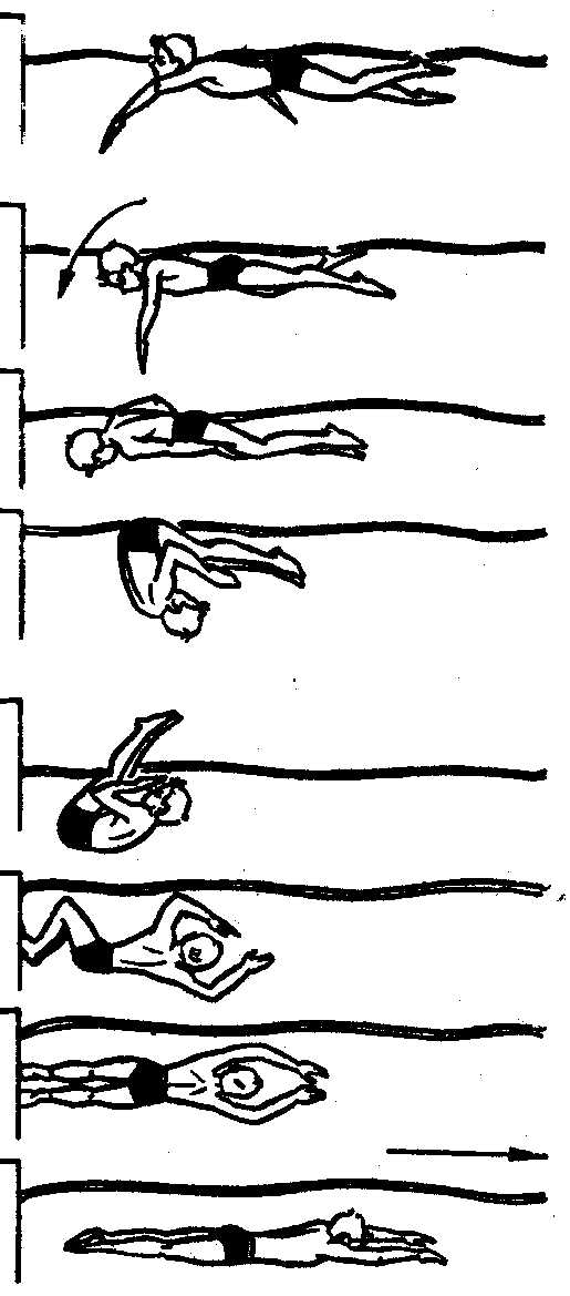 толчка и дальнейшего скольжения пловец окончательно разворачивается на спину.
